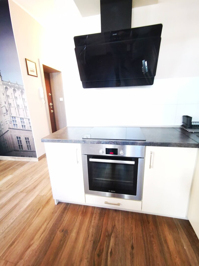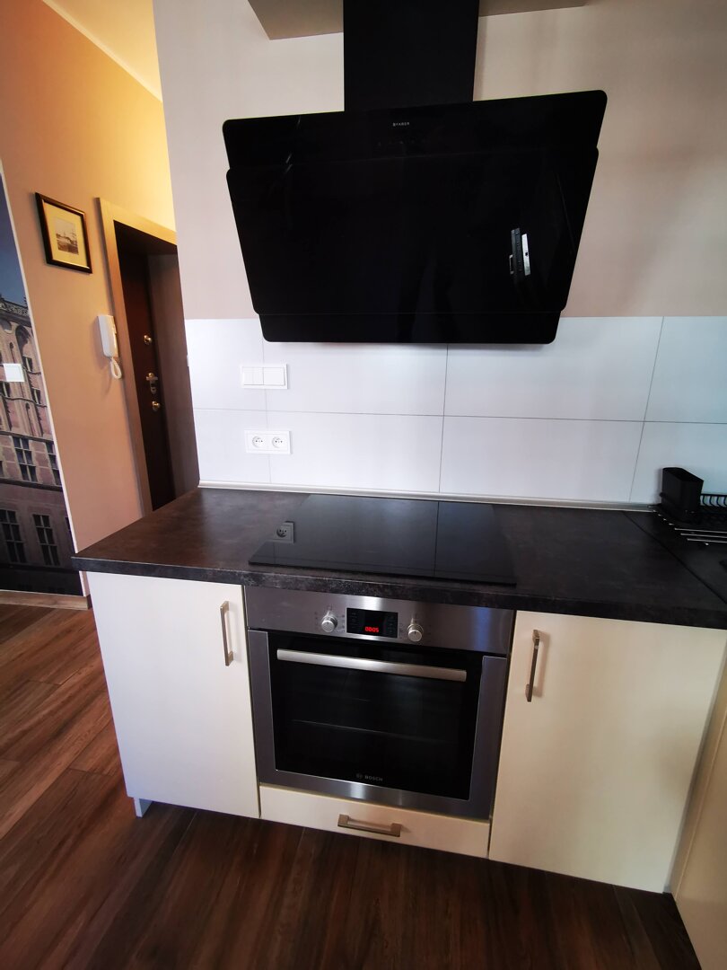 Tiene aproximadamente 45 m² y consta de dos habitaciones separadas, cocina totalmente equipada y baño moderno. El diseño interior mezcla el estilo escandinavo con toques locales de Gdansk, creando un ambiente acogedor, funcional y elegante.